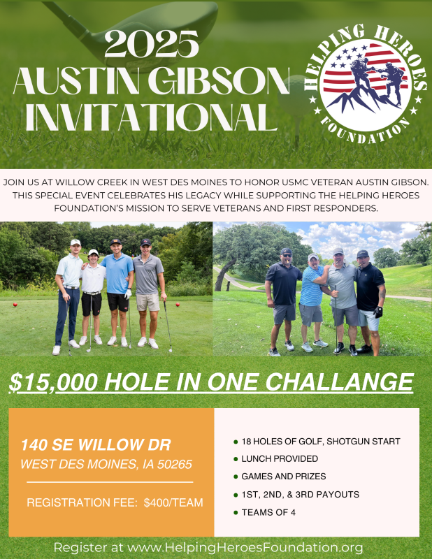Join us at Waveland Golf Course in Des Moines to honor USMC veteran Austin Gibson. This special event celebrates his legacy while supporting the Helping Heroes Foundation’s mission to serve veterans and first responders.