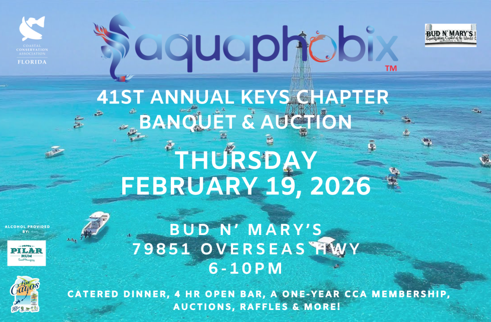 Please join us for the Aquaphobix 41st Annual CCA FL Keys Chapter Banquet & Auction at "The Barn" at Bud N' Mary's Marina in Islamorada, FL on Thursday, February 19th, 2026 from 6:00pm - 10:00pm. The night will kick off with open bar featuring Papa's Pilar rum, beer from Florida Keys Brewing and Los Cayos, a Castaway Coffee bar and an assortment of appetizers. There will also be an expansive silent auction and raffles, followed by a catered steak dinner and a live auction featuring top of the line fishing equipment and exotic trips around the world! Don't miss the fishing party of the year raising funds to help protect and enhance our marine resources! Let's make the 41st Keys Banquet the best one yet!!!