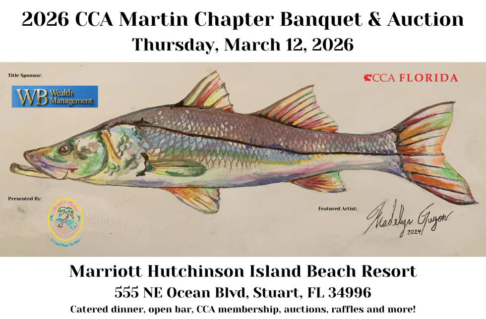 Please join us for the Wisehaupt, Bray Wealth Management 25th Annual CCA Martin Chapter Banquet & Auction presented by River Palm Cottages & Fish Camp. The evening will be held at The Marriott Resort Hutchinson Island in Stuart, FL on Thursday, March 12th from 6:00pm - 10:00pm! Guests will enjoy a catered dinner, open bar, auctions, raffles and more as we celebrate and support Florida's marine resources. Please welcome our new featured artist, Madelyn Guyon! She is so talented and just 13 years old!