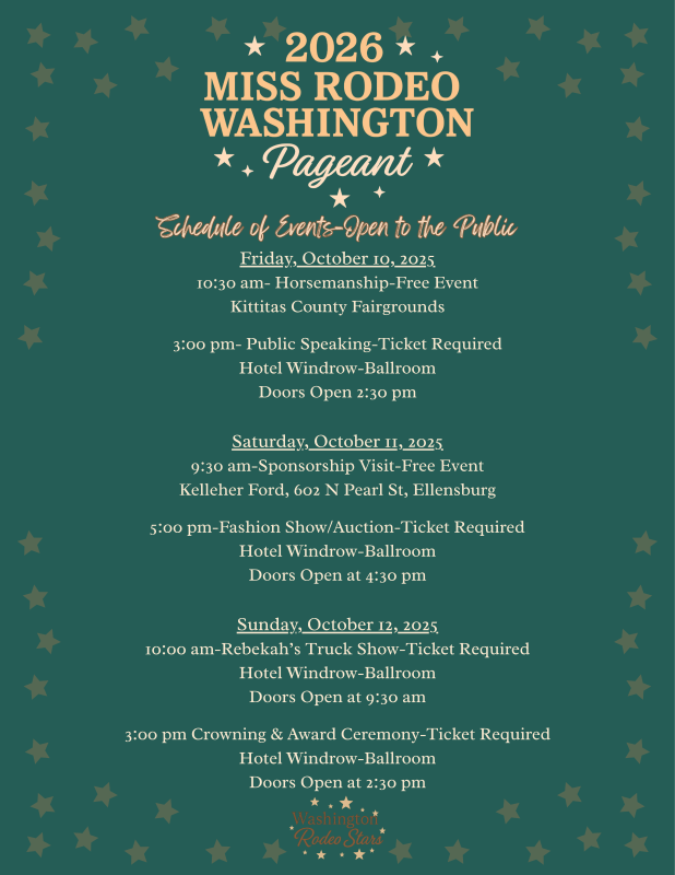 Come cheer on the incredible young women competing for the titles of Miss Rodeo Washington, Miss Teen Rodeo Washington, and Miss Rodeo Washington Sweetheart during three thrilling days of pageant excitement! Your support and applause can help light up their moment in the spotlight.