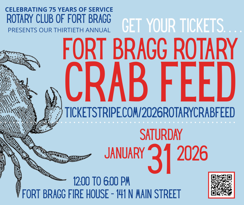 Get ready to crack, dip, and feast! The Rotary Club of Fort Bragg invites you to join us for our beloved Annual Crab Feed, a community favorite filled with delicious food, great company, and a shared spirit of giving.