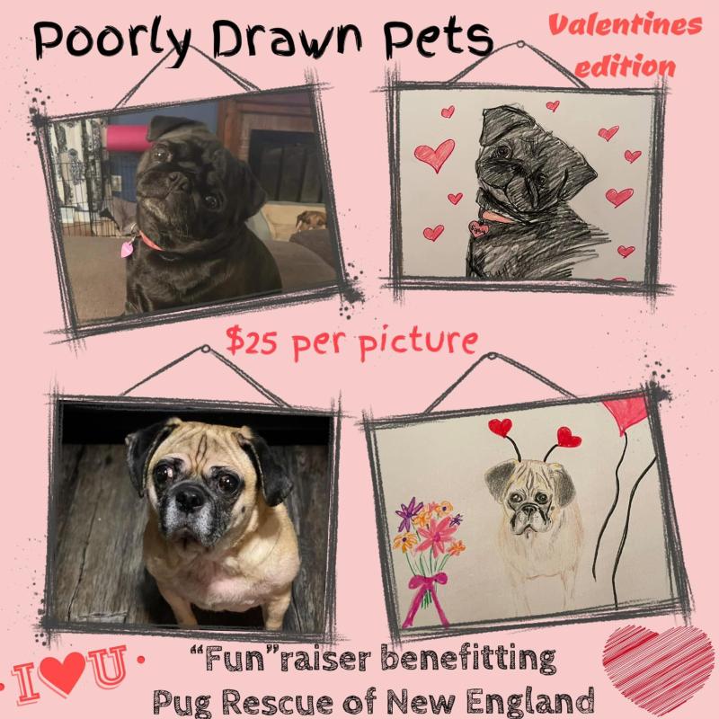With your $25 donation to Pug Rescue of New England, our volunteers will draw your pet with a fun spring theme. The catch, we are a lot better at caring for our rescues then we are at drawing them! After you complete your donation, please email your pet photo (one pet per photo, please) to events@pugrescueofnewengland.org.