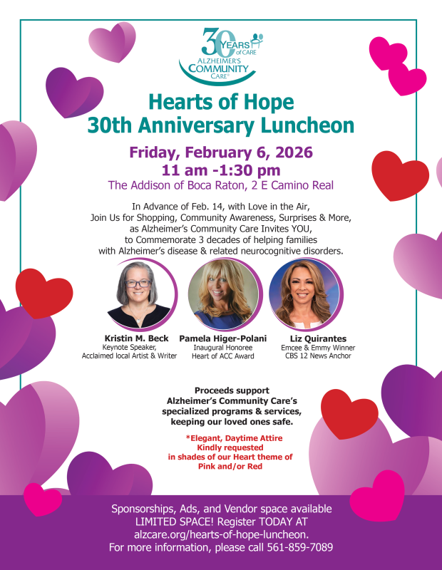 Guests will enjoy boutique shopping, with a portion of proceeds benefitting Alzheimer’s Community Care, and the presentation of the 2026 Hearts of ACC Award, honoring Pamela Higer-Polani for her outstanding dedication and leadership. Our featured speaker is local artist and writer Kristin M. Beck. The event will be emceed by CBS 12 anchor Liz Quirantes.