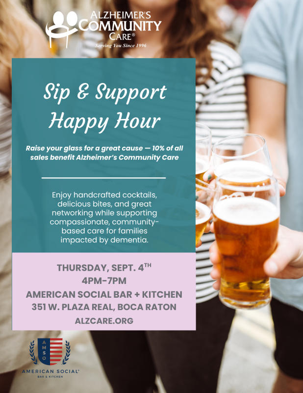 Enjoy drinks and good company while supporting a great cause. A portion of all proceeds will be donated to the ACC, helping us continue our mission of providing essential care and resources to those living with Alzheimer's and their families.
