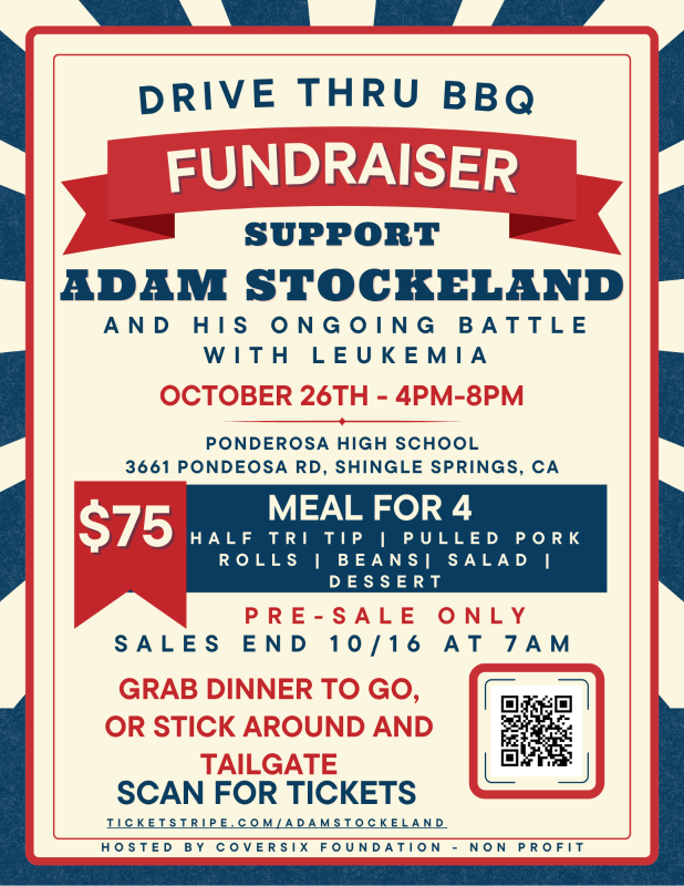 The El Dorado County Deputy Sheriff’s Association Cover Six Foundation, in collaboration with Thrive with 10-35, is organizing a drive-through BBQ fundraiser in support of Deputy Adam Stockeland as he continues his treatment for Leukemia. Deputy Stockeland is a United States Army Veteran and is a long serving Deputy with the El Dorado County Sheriff’s Office. His most recent assignment is as the School Resource Officer at Ponderosa High School. Deputy Stockeland is also an enthusiastic golfer and enjoys supporting his son's football pursuits and his daughter's cheerleading activities.