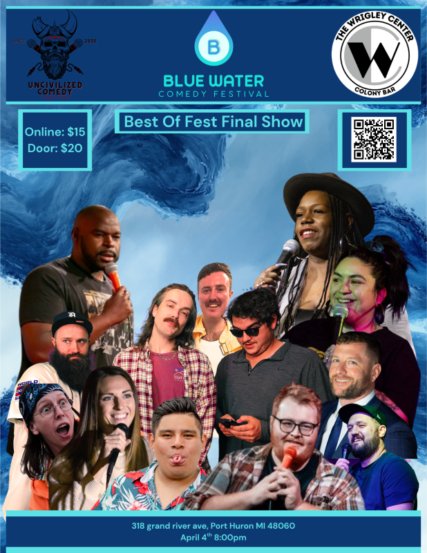 The Blue Water Comedy Festival wraps up its inaugural year with one last night of big laughs on Saturday, April 4th, 2026 at 8:00 PM, live at The Wrigley Center in Downtown Port Huron. This final show of the weekend is a full-blown stand-up showcase featuring some of the best upcoming comedy talent in the country — and beyond. Comics are flying in from Austin, Texas, one of the hottest comedy scenes in the world, and even as far as England, all coming together for a no-holds-barred night of stand-up to close out the very first Blue Water Comedy Festival.