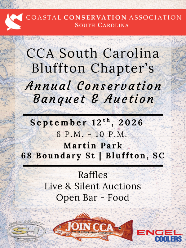 The 2026 CCA South Carolina Banquet Trail presented by Sea Hunt Boats is continuing the year in Bluffton, SC for the Bluffton Chapter's Annual Conservation Banquet on September 19th! Join us for an evening of food, drinks from the open bar, live and silent auctions, raffles, and music!