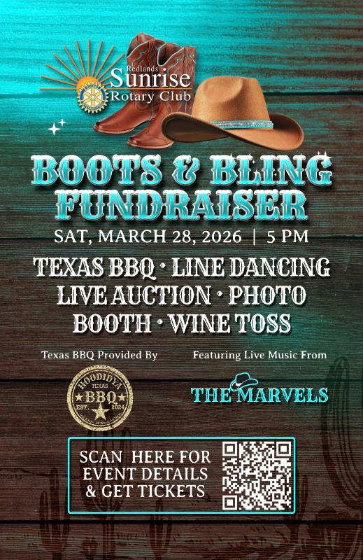 Redlands Sunrise Rotary Club is BACK AGAIN presenting "Boots & Bling" on.... Saturday, March 28, 2026 for our 2nd Annual Fundraiser at the most beautiful farm in Redlands! Join us for live music by The Marvels with line dance instruction and a delicious All Wood, No Bull Texas BBQ by Hoodidya BBQ. We are looking forward to hosting a saloon-style bar with signature drinks, exclusive live auction, 50/50 drawing, photo booth, wine toss, and many more surprises!