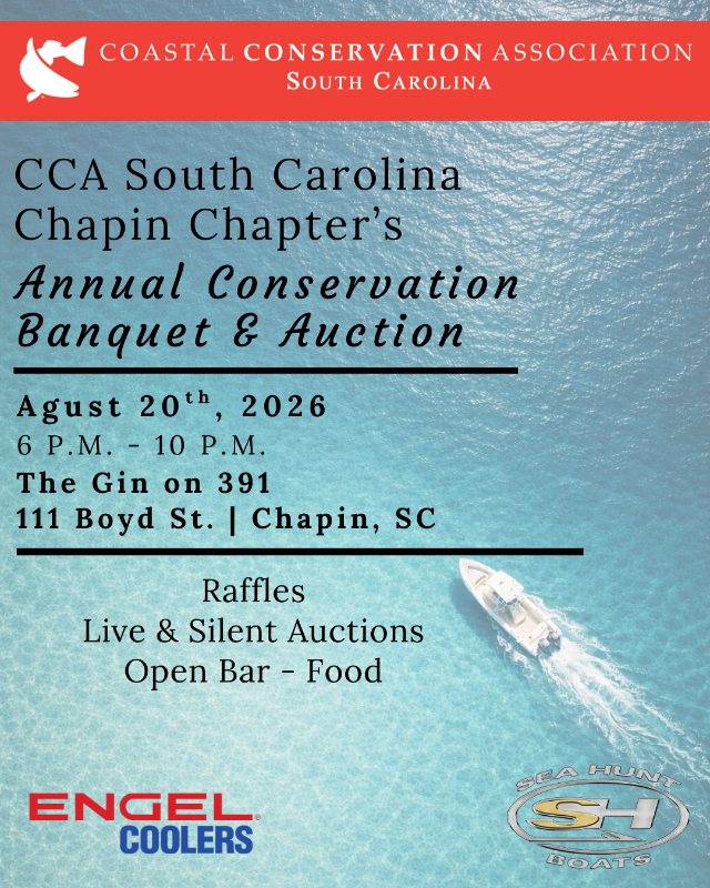 The 2026 CCA South Carolina Banquet Trail presented by Sea Hunt Boats is continuing the year in Prosperity, SC for the Chapin Chapter's Annual Conservation Banquet on August 20th! Join us for an evening of food, drinks from the open bar, live and silent auctions, raffles, and music!