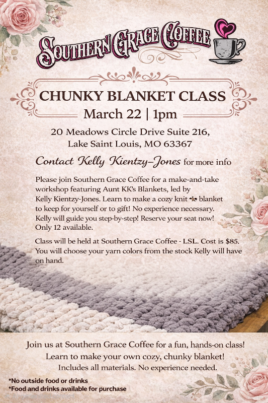 Please join Southern Grace Coffee- Lake Saint Louis) for a make-and-take workshop featuring Aunt KK's Blankets, led by Kelly Kientzy-Jones. Learn to make a cozy knit blanket to keep for yourself or to gift! No experience necessary, Kelly will guide us step-by-step! Reserve your seat now! Only 12 available.