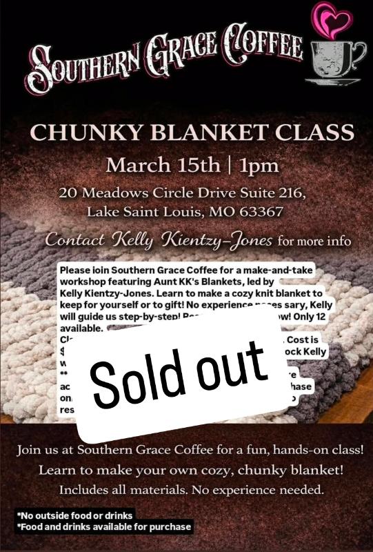 Please ioin Southern Grace Coffee for a make-and-take workshop featuring Aunt KK's Blankets, led by Kelly Kientzy-Jones. Learn to make a cozy knit blanket tc keep for yourself or to gift! No experience neces sary, Kelly will guide us step-by-step! Reserve your seat now! Only 12 available.