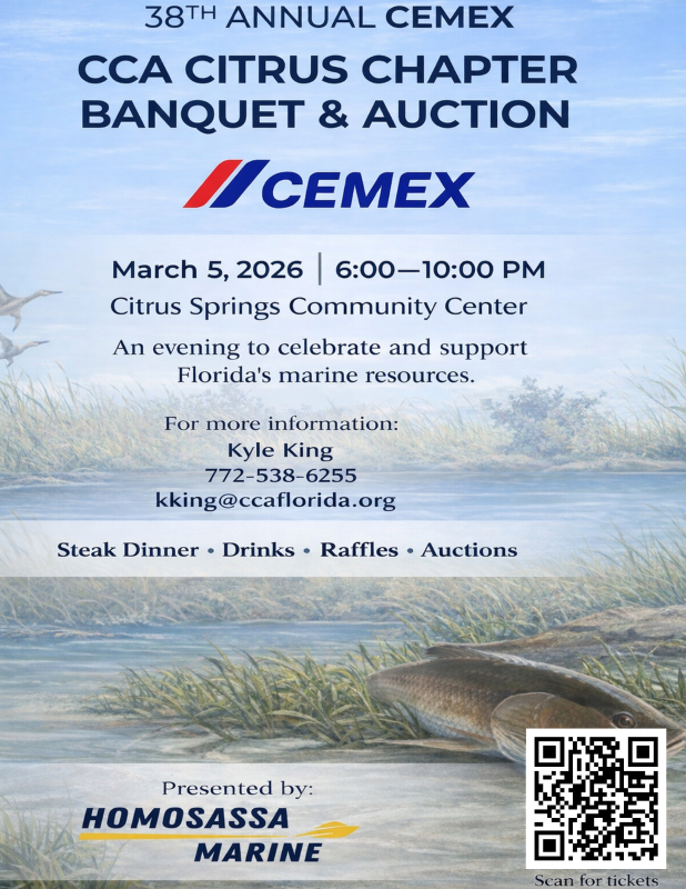 Join us for the 38th Annual CCA Citrus Chapter Banquet and Auction, an exciting evening dedicated to celebrating and supporting Florida's marine resources. The event will feature thrilling raffles, engaging silent auctions, and dynamic live auctions offering exclusive prizes and unforgettable trips.
