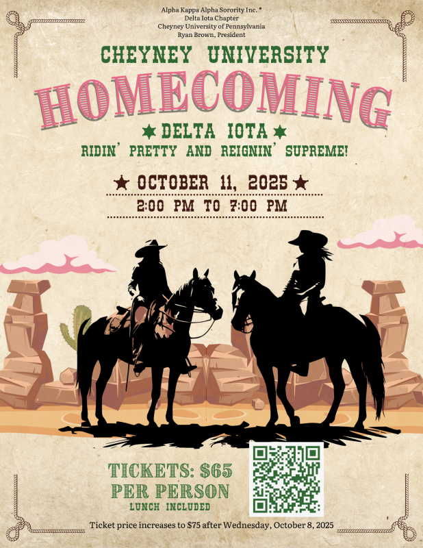 Join the Delta Iota Chapter on Saturday, October 11th, from 2pm-7pm as we celebrate Cheyney University's Homecoming! Tickets include access to our Delta Iota Homecoming Tent activities, an entry for our raffle, lunch, and other light refreshments. We hope to C U there!