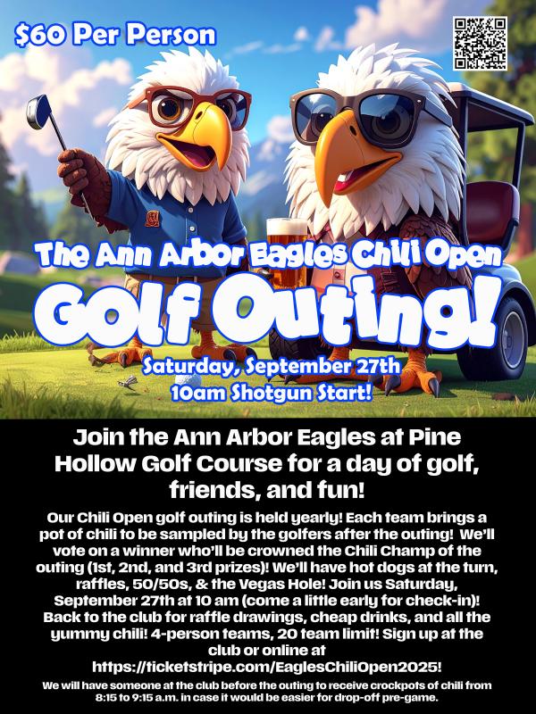 Join the Ann Arbor Eagles at Pine Hollow Golf Course for a day of golf, friends, and fun! Our Chili Open golf outing is held yearly! Each team brings a pot of chili to be sampled by the golfers after the outing! We’ll vote on a winner who’ll be crowned the Chili Champ of the outing (1st, 2nd, and 3rd prizes)! We’ll have hot dogs at the turn, raffles, 50/50s, & the Vegas Hole! Join us Saturday, September 27th at 10 am (come a little early for check-in)! Back to the club for raffle drawings, cheap drinks, and all the yummy chili! 4-person teams, 20 team limit! Sign up at the club or online!