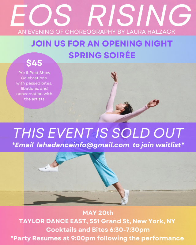 Join us for our opening night performance and celebration! Doors open at 6:30pm for a pre-performance cocktail hour with festive libations and passed bites. Performance begins promptly at 7:30pm. See Waking Ostara, a joyful new work in progress, the full production premieres of Frequency and Stardust, and the return of Ms. Halzack's first full length work Currents (2023). The celebration will resume immediately following the show with more drinks, passed hors d’oeuvres (both savory and sweet), and lively conversation with Laura and the dancers. It will be a night to remember!