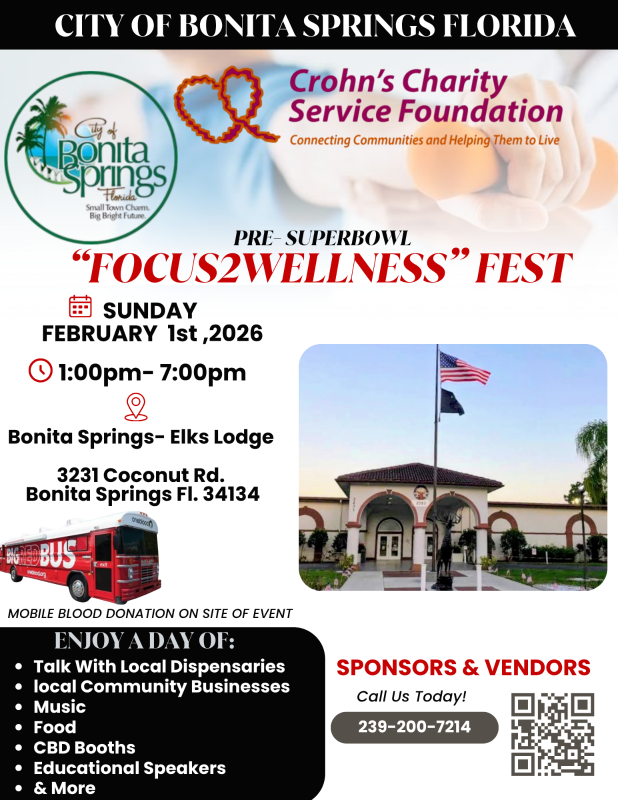 Crohn's Charity Service Foundation (a Florida nonprofit) is hosting a Community events" during our season when the Bonita Springs residents return. CCSF Pre-Superbowl signup February 1 and March 29 our Pre-4 20 . We'd like to invite all Dispensary to participate by being a sponsorship, THERE WILL BE NO EVALUATIONS AT THIS EVENT..