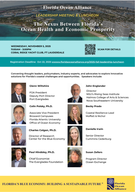 The Nexus Between Florida's Ocean Health & Economic Prosperity. Alliance members, marine and coastal experts, and advocates from around the state will gather at the Coral Ridge Yacht Club in Fort Lauderdale. This pivotal event will convene policymakers, industry experts, academics, and advocates to explore innovative solutions for Florida's coastal challenges and opportunities. Florida's ocean and coastal ecosystems are not only vital to our environment but also to our economy, supporting industries from tourism to technology. Florida Ocean Alliance has been at the forefront of uniting leaders across sectors to champion sustainable ocean practices.