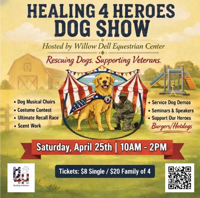 Join us for a heart-warming, high-energy community event benefiting Healing4Heroes, where rescue dogs are trained to become life-changing service animals for Veterans, First Responders, and Children in need. This family-friendly dog show and costume contest will take place in the beautiful farm and arena setting of Willow Dell Equestrian Center, bringing together exciting dog games, inspiring demonstrations, educational speakers, great food, and meaningful opportunities to connect with fellow animal lovers and supporters of our heroes.