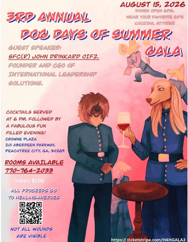 Please join us for an evening of celebration and fundraising at Healing4Heroes Summer Gala Dinner, “Dog Days of Summer (III)”. Come and support our amazing heroes receive and train with a lifesaving service dog. Wonderful dinner, dancing and auction.