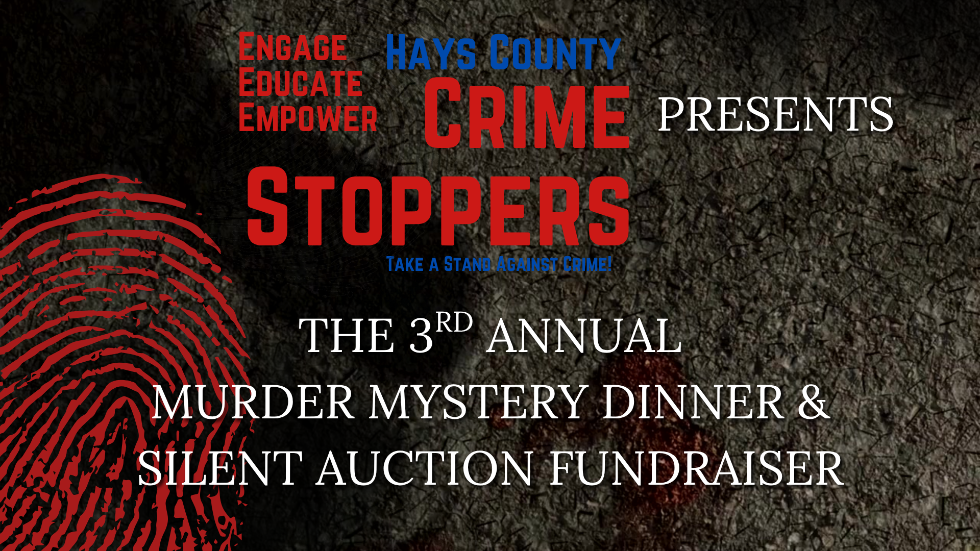 Mark your calendars for Saturday, October 11, 2025, and join Hays County Crime Stoppers, Inc. at the Wimberley Community Center located at 14068 Ranch Road 12 in Wimberley for the 2025 Murder Mystery Dinner and Silent Auction! Doors open at 5:30pm.