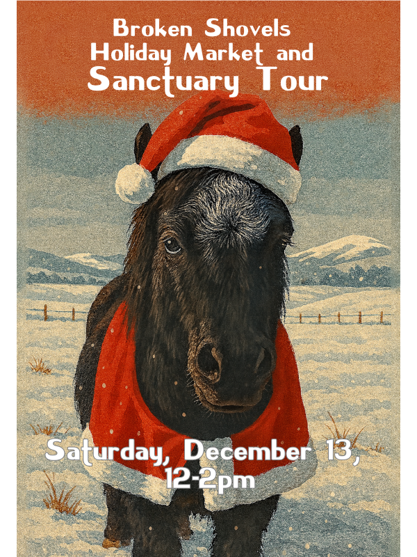 Join us for one of our favorite traditions — a cozy, festive afternoon surrounded by the animals who make Broken Shovels so special. Wander through our winter animal wonderland, meet the residents, and find unique, heartfelt gifts that give twice: once to your loved ones, and again to the rescued animals who call the sanctuary home.