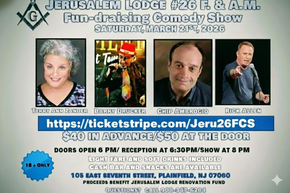 Join MW Omar S. Morris, Grand Master of Freemasons of NJ and his First Lady Stephanie for a night of outragous comedy on Saturday, March 21, 2026, while FUN-DRAISING the Jerusalem Lodge #26 F & AM 5-Million Dollar Historic Building Renovation Project. The program will be held in the Grand Ballroom on the 2nd Floor of the historic Plainfield (NJ) Masonic Building at 105 East 7th Avenue (corner of 7th Ave and Park Ave), with secure parking in the Municipal Lot across the street. The Stand-up Comedy Show features 3 nationally-recognized recognized Comedians - Terry Ann Zander, Chip Ambrogio, and Headliner Rick Allen plus Jerusalem's own Barry Drucker (aka RW Barry Gould). Admission includes light fare and your first beer, wine or soft drink. Doors open at 6 pm, Social Hour Food and Drink Service begins at 6:30 pm, Show starts at 8pm. Additional snacks and beverages will be available. Tickets are only $40 per person if purchased in advance at Ticketstripe.com/Jeru26FCS, or $50 at the door. Please note that this is a comedy event for adults only. No one under 18 admitted. Please make your reservations as early as possible, because we expect this show to SELL OUT!