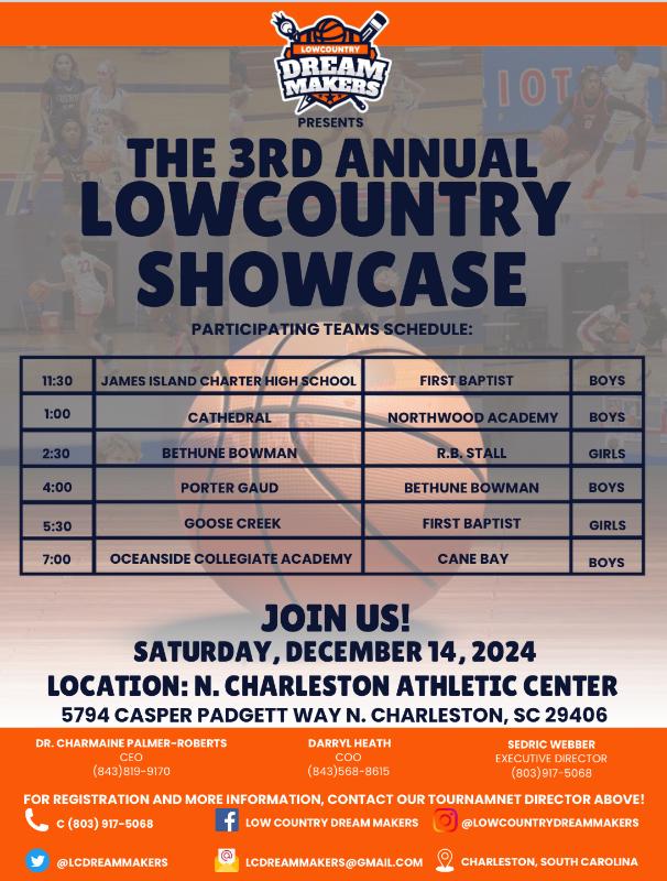 Join us for the 3rd Annual Lowcountry Showcase, where top high school athletes from across the Lowcountry will compete in a day of exciting matchups and showcase their talents for college scouts, coaches, and fans! This premier event brings together some of the best teams, offering a thrilling experience for sports enthusiasts and a great opportunity to support up-and-coming athletic talent. Don't miss out on this action-packed day!