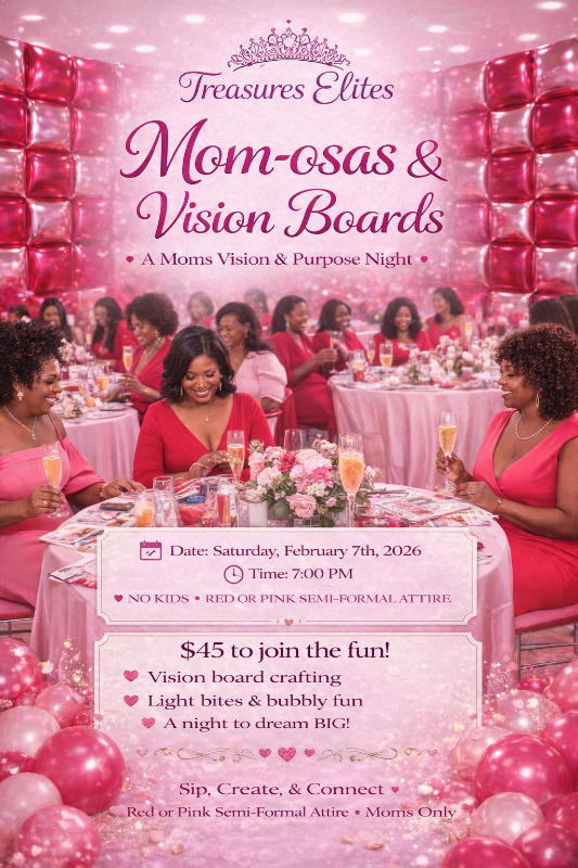 ✨ Enjoy a beautifully decorated space, lite refreshments, and an intentional vision board experience surrounded by other amazing moms.