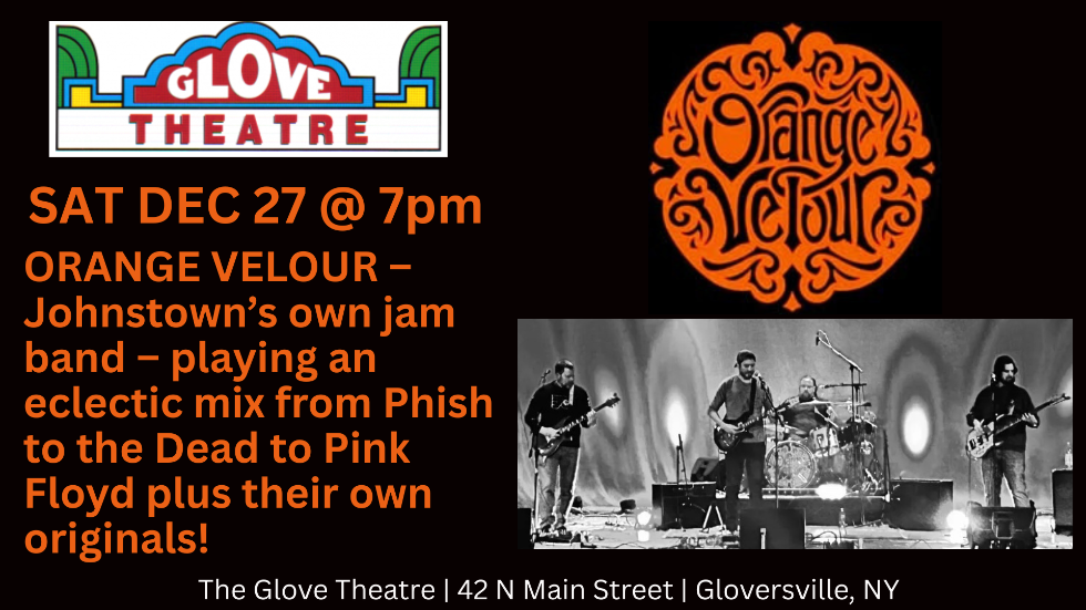 Here’s what High Vibrations Media said about last year’s show: “Orange Velour lit up the Glove Theatre in Gloversville, NY, on December 27, 2024, delivering a performance that was equal parts electrifying and unforgettable. With Adam Gurga (vocals, guitar), Jeff Blaha (vocals, guitar), Brian Breyo (vocals, bass), and Whelan Hounsel (vocals, drums) commanding the stage, they treated us to an incredible mix of covers and originals, proving why they have such a massive local following.