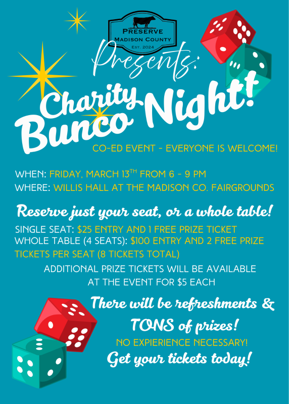 Join Preserve Madison County for our first annual Charity Bunco Night on March 13, 2026 from 6 pm to 9 pm. Doors will open at 5:30.