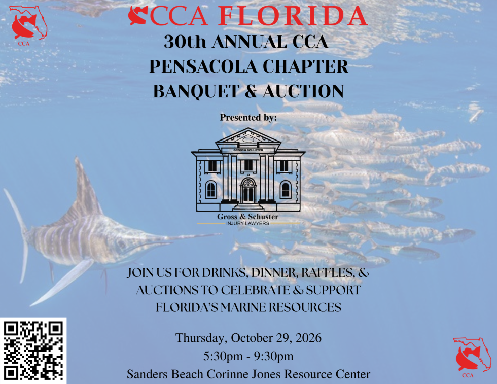 Join us for the 30th Annual CCA Florida Pensacola Chapter Banquet & Auction—a signature evening celebrating our coastal heritage and uniting the community in support of marine conservation. This year’s event will take place at Sanders Beach Corinne Jones Resource Center in Pensacola, offering an upscale and welcoming atmosphere for an evening of fellowship, fundraising, and fun.