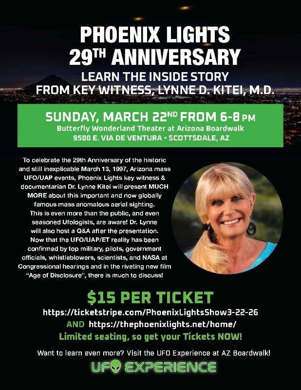 To celebrate the 29th Anniversary of the historic & still inexplicable March 13, 1997 AZ Mass UFO/UAP Events, key witness Dr. Lynne D. Kitei, M.D. will present the "INSIDE PHOENIX LIGHTS STORY". There is MUCH MORE to this important and now globally famous mass anomalous aerial sighting than the public, Media and even seasoned Ufologists are aware!