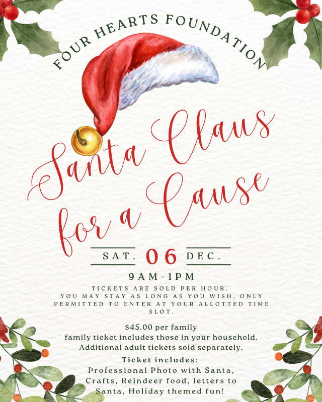Thank you for the interest in SANTA CLAUS for a CAUSE. This event is filled with magic. Ticket price includes all activities! (Santa letters, reindeer food etc). It also includes a professional photo by Kelsea Godek Photography (who volunteers her time yearly-- the GOAT!) Ticket price is per family (this includes your hosuehold only. ) Extra adult tickets (like grandparents, aunts, friends) are sold seperately. If you are brining an extra child, please also purchase this (example a niece or nephew or friend). This allows us to keep pricing fair and keep the crowd a managable size! Please note the tickets are sold per hour. You will not be permitted to admit at any time other than your time slot. You may stay as long as you like, however you have to abide by your time slot. This allows us to keep the crowd managable and have kids not wait for things (aka- more magical for all!) ! Thank you for understandning and following the rules :)