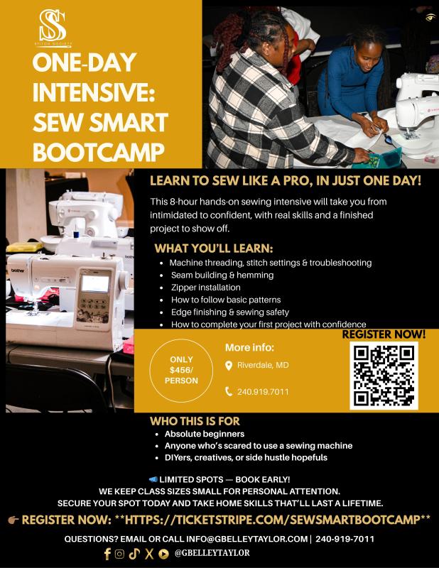Ready to finally conquer your sewing machine and bring your creative ideas to life? Join us for the Sew Smart Bootcamp, a transformative one-day sewing intensive for beginners and returning sewists. In just 8 hands-on hours, you’ll gain confidence behind the machine, learn essential techniques, and complete your very own project, all in a supportive, small-group setting. All materials and equipment are provided, and you'll leave with a workbook, certificate of completion, and the skills to hem, repair, and sew with purpose. Whether you're dreaming of designing, altering, or just learning for yourself, this experience is your perfect starting point.