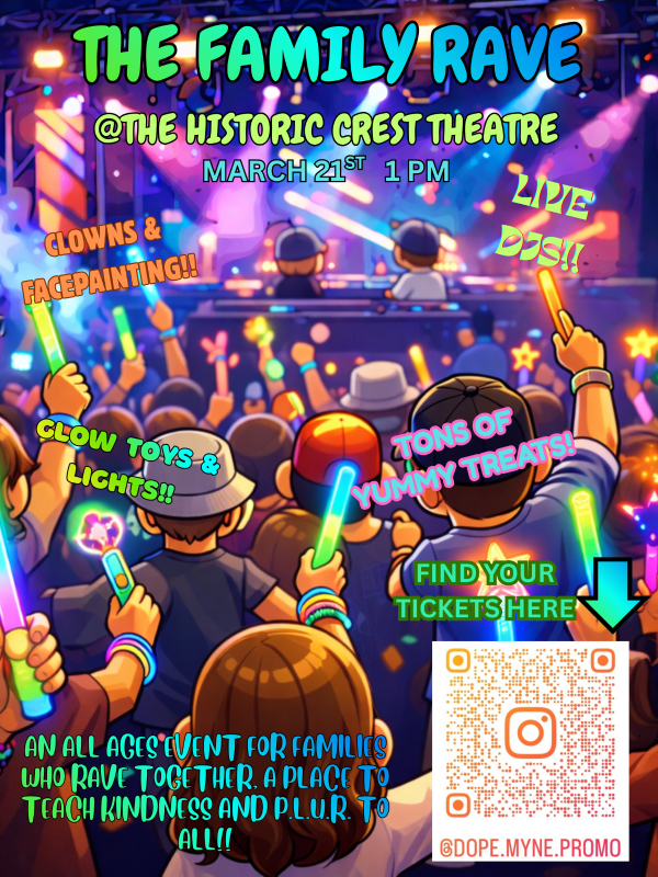 These are tickets for the Family Rave at The Historic Crest Theatre!! March 21st at 1pm this show is recomended for ages (4-14) and children under the age of 18 must be accompanied by an adult. This is a drug and alcohol free event so please be respectful !!!! Each ticket gets you in the door to see two sets of a dj playing child friendly electronic dance music!! Each set is 45 mins with a short intermission.And our DJ is creating fun and entertaining set just for you!! There will be food and beverages as well as fun glow toys,facepainting ,ballon animals,a photo backgroud and other fun rave gear for purchase inside so come prepared!! We are so excited to share this family event with everyone!!! SEE YOU THERE!