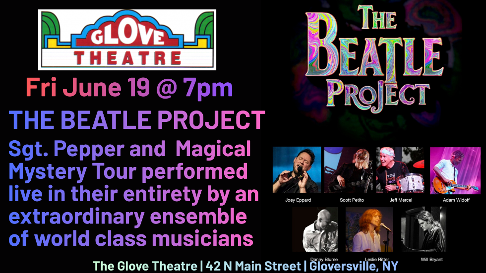 The Glove Theatre is thrilled to present The BEATLE Project | Sgt Pepper & Magical Mystery Tour -- both albums performed live in their entirety by an extraordinary ensemble of world class, veteran musicians -- under the direction of bassist, producer, arranger, Scott Petito. The band includes: Joey Eppard (guitar/vocals), Adam Widoff (guitar), Danny Blume (guitar/vocals), Jeff Mercel (drums/keys), Will Bryant (keys/vocals), Scott Petito (bass, keys), Leslie Ritter (vocals).