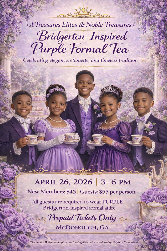Join us for an elegant afternoon celebrating etiquette, excellence, and new beginnings at our Bridgerton-Inspired Purple Formal Tea. This formal pre-Cotillion event includes ceremonial moments, tea service, and a plated meal in a beautiful indoor/outdoor setting.