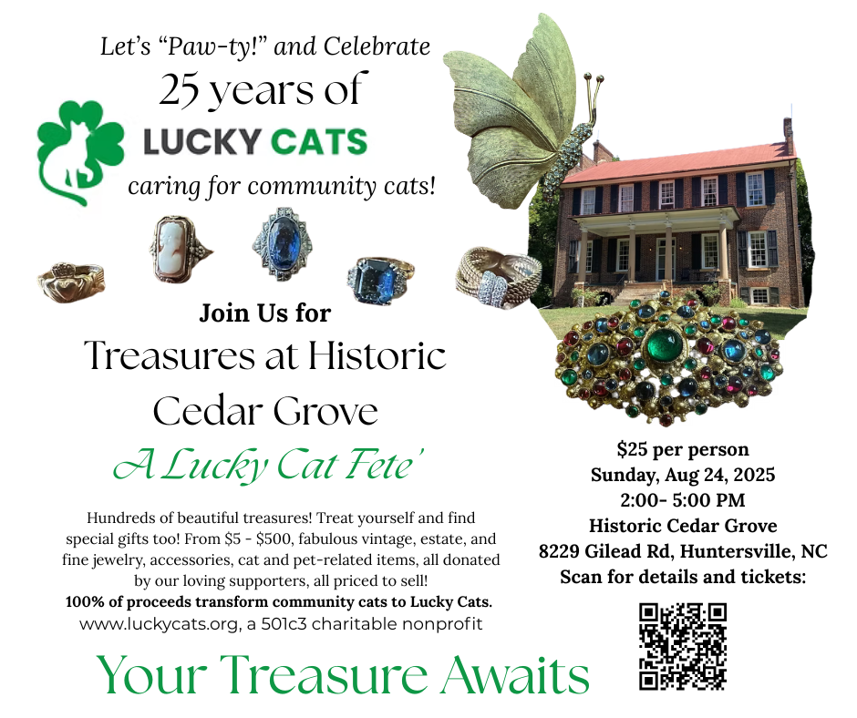Join us for “Treasures at Cedar Grove,” a distinctive and impactful afternoon fete’ benefiting the non-profit, Lake Norman Lucky Cats, to be held at the historic brick Greek Revival landmark, Cedar Grove, at 8229 Gilead Road, Huntersville, NC on Sunday, August 24, 2025, from 2:00 PM to 5:00 PM. We have air-conditioning!