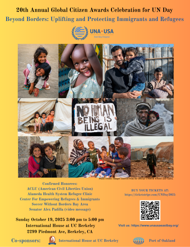 With the theme “Beyond Borders: Uplifting and Protecting Immigrants and Refugees,” the UNA-East Bay’s UN Day event will for the twentieth year again showcase organizations and individuals that demonstrate exemplary achievements and impact directly linked to a United Nations goal. The 2025 honorees are champions of rule of law, support services, advocacy for human rights, dignity and respect for all – including immigrants and refugees in our East Bay community.