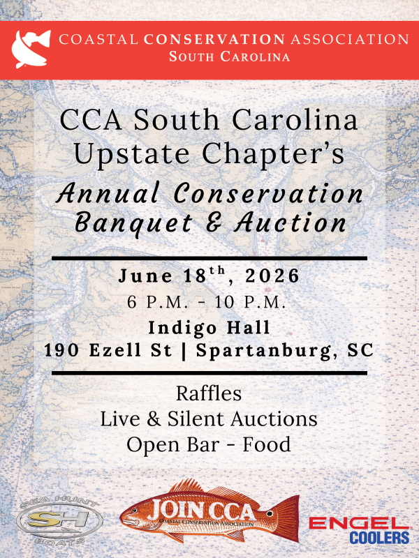 The 2026 CCA South Carolina Banquet Trail presented by Sea Hunt Boats is continuing the year in Spartanburg, SC for the Upstate Chapter's Annual Conservation Banquet on June18th! Join us for an evening of food, drinks from the open bar, live and silent auctions, raffles, and music!
