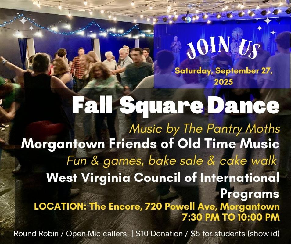 On Saturday, September 27th, WVCIP will be hosting a square dance, featuring music by The Pantry Moths! We’ll have games, a bake sale, and a cake walk- all this will be taking place at The Encore at 720 Powell Ave in Morgantown, WV from 7:30pm - 10:00pm.