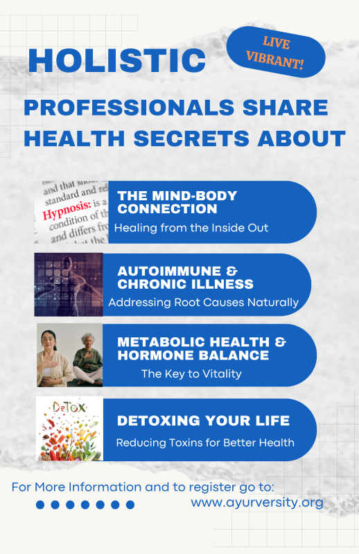 Join Ayurversity for an adult-focused, education-only seminar designed to introduce holistic perspectives on physical, emotional, and spiritual health. This experience is rooted in learning, awareness, and empowerment—with no vendor sales or commercial promotion.