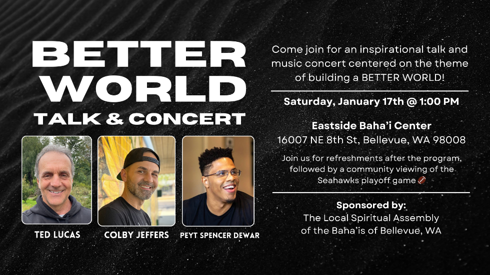 Hosted by the Local Spiritual Assembly of the Baha'is of Bellevue, Washington featuring a talk by Mr. Ted Lucas and musical performances by Baha'i-inspired rappers, Colby Jeffers & Peyt Spencer Dewar.