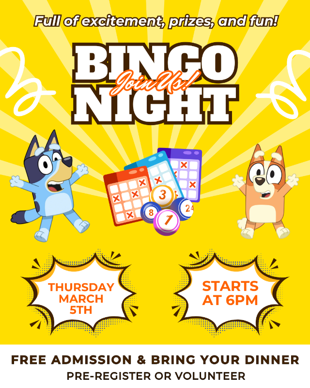 Grab the whole family and join us for a night of laughs, prizes, and fun at our PTO Bluey-themed Family Bingo Night!