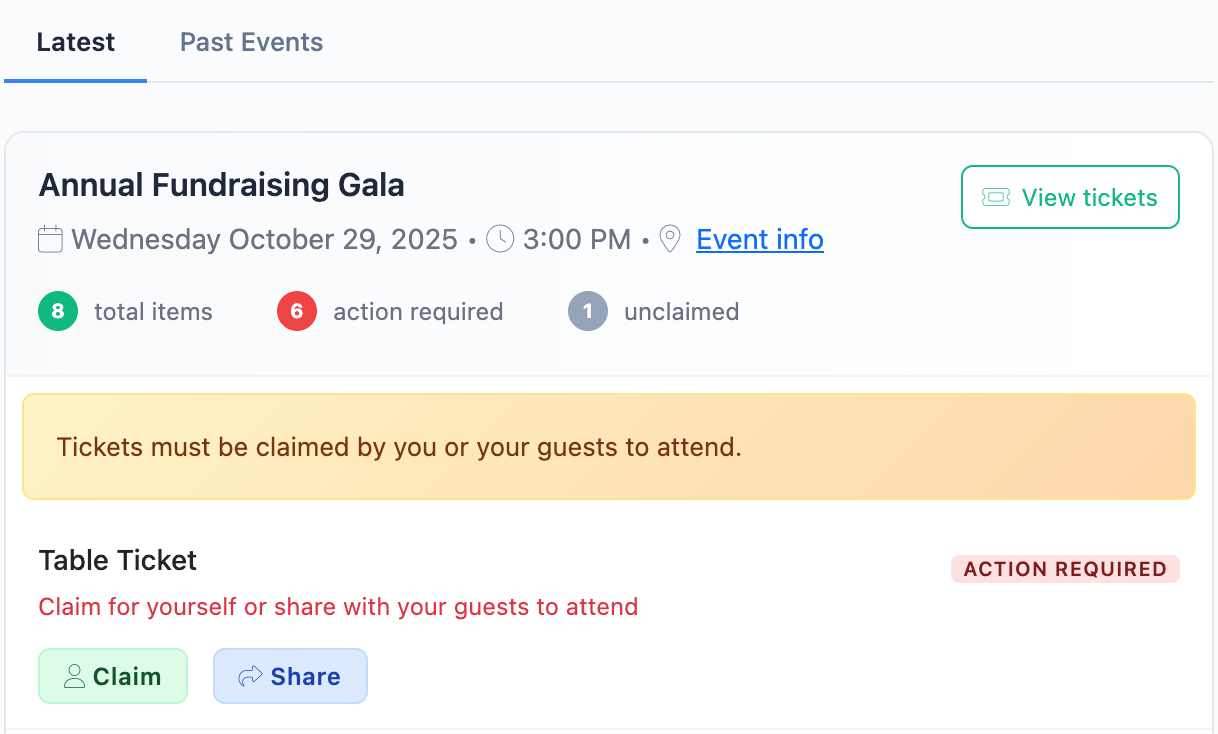 - Quick filters offer instant views of tickets requiring action, helping attendees see at a glance which tickets still need to be shared or claimed