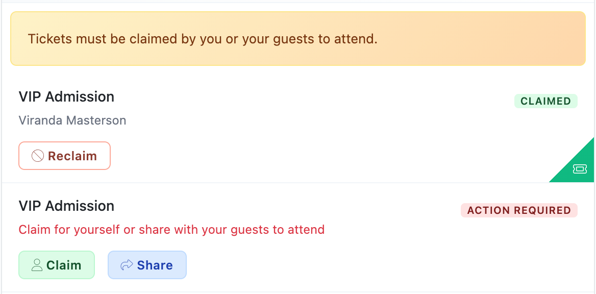 - When claiming is optional and no additional information is requested: “Claim or Share with your guests to change ticket details”