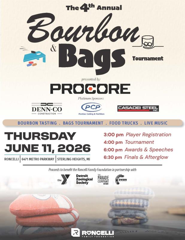 Registration opens at 3:00 p.m. and the bags tournament begins at 4:00p.m. sharp (not all tickets have entry into the tournament). The tournament will be faster run this year (2.5 hours), and more teams will advance to playoffs (see updated rules below). All tournament players need to be registered by 3:45 p.m. If players are not registered on time, teams will be disqualified. All entrants will enjoy complimentary valet, open bar (21+), food trucks, bourbon tasting, cigars, and live music! If consuming alcohol, the Roncelli Family Foundation and Roncelli Inc. highly recommends using a ride share service; attendess will receive an Uber code prior to the event for discounted rides to and from the fundraiser! To make parking easier, we encourage guests to carpool or rideshare if possible.