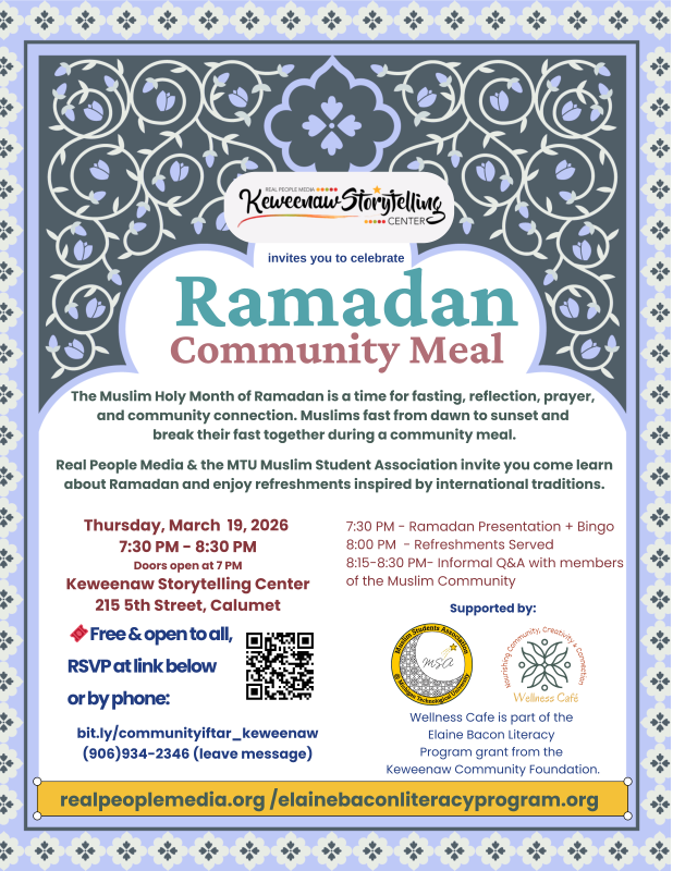 Curious about Ramadan? Want to learn more about the traditions of Islam? Or simply share a meal in community? Join us for a warm and welcoming evening at the Ramadan Community Iftar at the Keweenaw Storytelling Center. Ramadan is the ninth month of the Islamic calendar — a time of fasting, reflection, prayer, and community connection. Muslims fast from dawn to sunset and gather to break their fast during Iftar. This event is open to everyone — whether you are Muslim or simply interested in learning and building bridges in our community.