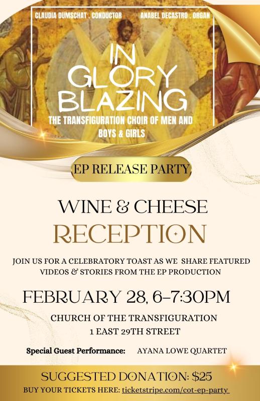 We are excited to share that the recording from last year's spring concert will be officially released on Friday February 28, and we are going to celebrate! The EP Release party will start at 6 pm and includes featured videos from the EP, and a toast to this celebratory moment at our wine and cheese reception with a live jazz performance by the Ayana Lowe Quartet. Suggested donation is $25 per person with all proceeds supporting our choirs' trip to England this summer.