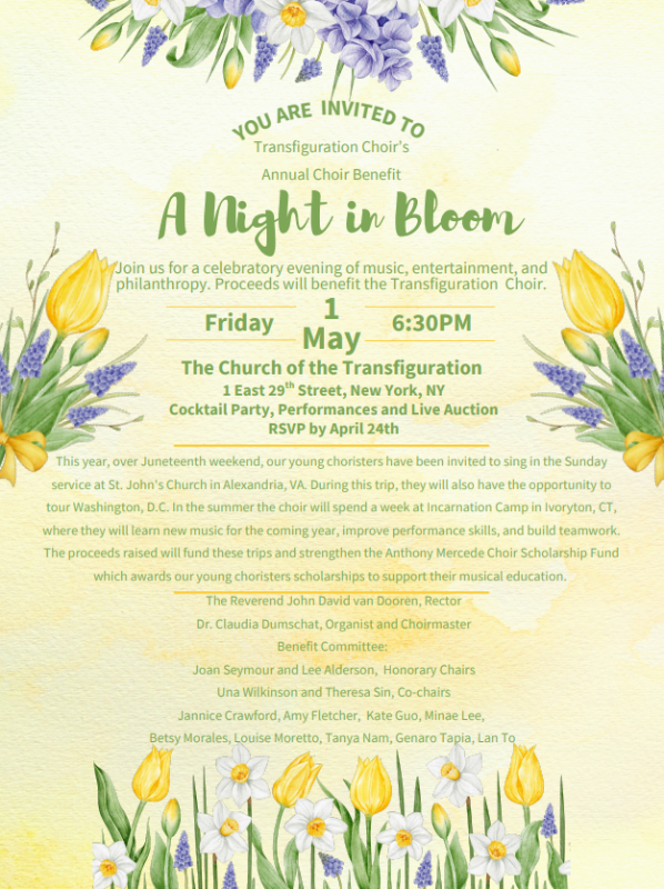 Join us for a celebratory evening of music, entertainment, and philanthropy. Proceeds of our cocktail party with performances and live auction will benefit the Transfiguration Choir. If you are planning to attend, please purchase tickets by April 24th.